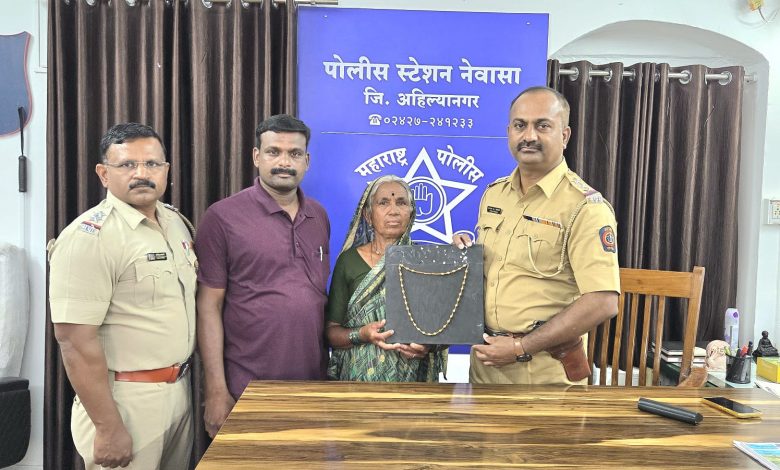 सौंदाळा तालुका नेवासा येथील गुन्ह्यात जे सोने जबरीने चोरून नेले होते ते परत मिळवण्यासाठी यातील फिर्यादी अशोक मुरलीधर आरगडे राहणार सौंदाळा यांनी नेवासा न्यायालयात विनंती अर्ज केला होता. न्यायालयाने याबाबत नेवासा पोलिसांचे म्हणणे मागितले होता. नेवासा पोलिसांनी फिर्यादीस सोन्याचे दागिने परत करण्याबाबतचा सकारात्मक अहवाल दिल्यानंतर फिर्यादीचे जबरीने चोरून नेलेले सोन्याचे दागिने फिर्यादीस परत करण्याचे आदेश न्यायालयाने दिले होते. त्याप्रमाणे सदरचे सोन्याचे दागिने शुक्रवार (दि. 11) रोजी फिर्यादी द्रोपदाबाई मुरलीधर आरगडे रा. सौंदाळा, ता. नेवासा यांना विधीवत त्यांच्या ताब्यात देण्यात आले आहे, याबाबत फिर्यादीने आनंद व्यक्त केला.